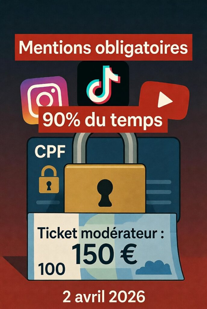 En parallèle, le décret n° 2026-233 du 30 mars 2026 impose des règles très contraignantes aux influenceurs et organismes de formation qui communiquent sur les formations financées par des fonds publics.